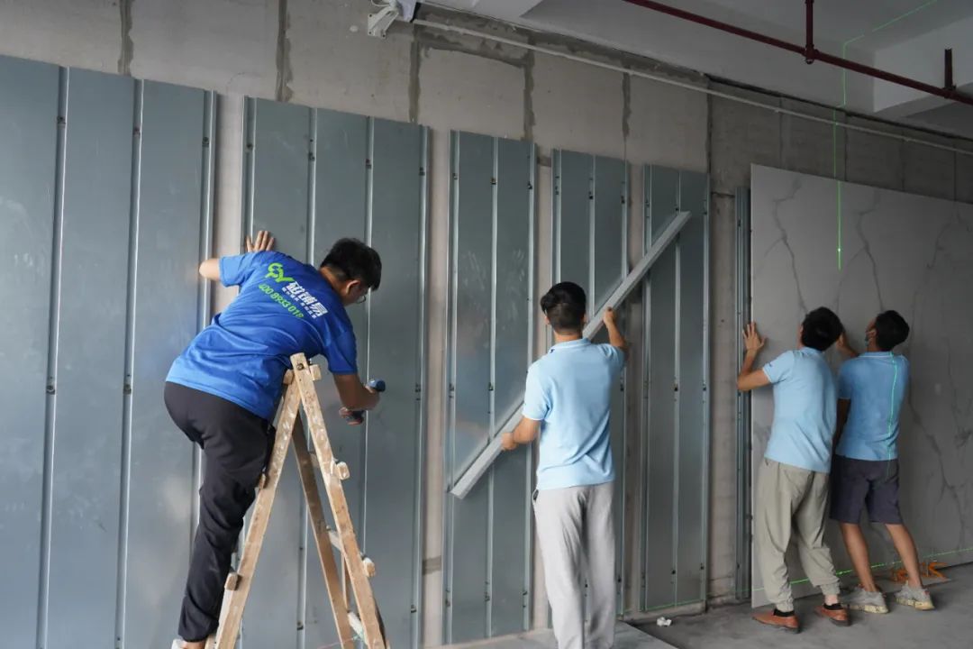 地面快裝系統(tǒng)也有兩個解決方案,一是由架空地板快速找平模塊+磁性層+表面飾材(如巖板)組成的解決方案,適用于公裝領域;另一個則是由石膏(或水泥)自流平+磁性層+表面飾材(如巖板)組成的解決方案,適用于家裝領域。   這二大系統(tǒng)運用“裝配式”方式能顯著地提高施工效率,據(jù)統(tǒng)計:磁鋪快裝系統(tǒng)比傳統(tǒng)鋪裝效率提升3-5倍,材料成本減少30%-50%,搬運成本節(jié)省80%,建筑垃圾減少90%。目前公司的磁鋪快裝研究院正在試驗3.0版本的地面和墻面快裝系統(tǒng),不久就會推向市場。相信這款升級后的系統(tǒng)將進一步提高施工效率,施工成本也將會進一步降低。